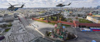 - Авиация берёт старт с нескольких подмосковных аэродромов и входит в воздушное пространство Москвы со стороны Химок. Авиационная техника пролетает над столицей вдоль оси Ленинградского шоссе, над площадью Белорусского вокзала и Тверской улицей. Высота пролёта боевых вертолётов — около 150 м., самолётов — 300 м. В мероприятии примут участие: вертолёты МИ-35, КА-52, МИ-28Н, транспортные МИ-26, самолёты-истребители модификаций СУ и МИГ, стратегические бомбардировщики и ракетоносцы, штурмовики СУ-25, транспортные и десантные самолёты АН-124 и ИЛ-76МД, авиация воздушной заправки.